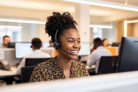 Professional young black female call center operator wears a headset and smiles while assisting a client on a computer in a busy corporate office environment with colleagues working behind her.