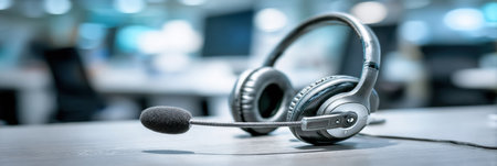 A headset is resting on a wooden desk inside a contemporary office, highlighting tools used for communication in a busy work environment during business hours.