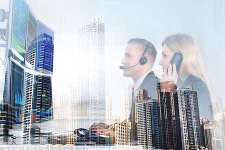 Double exposure of stock market brokers and modern office buildings