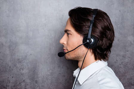side-view photo of handsome young operator in call-center with headphones
