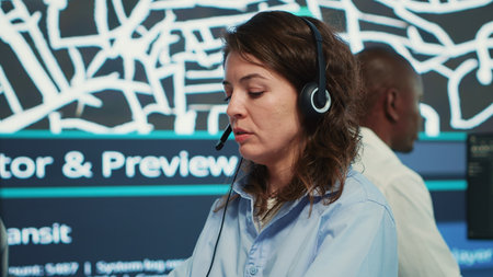 Call center employee communicating alternative routes for couriers, trying to avoid traffic by using satellite city map and surveillance CCTV footage. Operator gives gps directions. Camera A.
