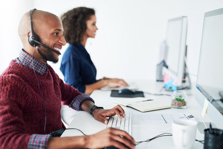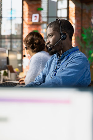 Helpful call center agent at office desk handling customer inquiries, complaints and support requests. African american customer service representative assists clients with issues related to products