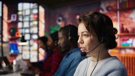 Customer support workers listening to clients problems using headphones. Call center agents in office using headset microphone to provide information, solving customers concerns, camera B close up