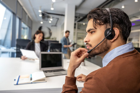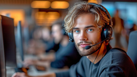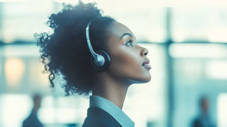 focused business professional in customer service role, wearing headset and engaged in call center environment, exudes confidence and dedication.