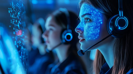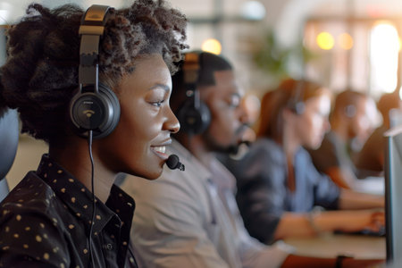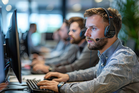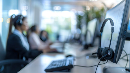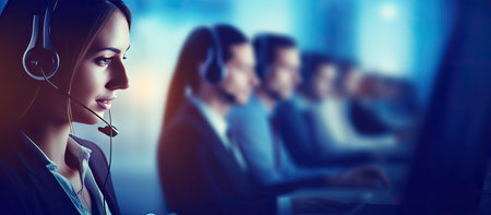 Customer service representatives with headsets working diligently in a modern office environment.