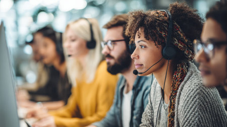 Multiethnic call center agents work at their stations, engaging with remote customers and processing service requests. Computers, coffee cups, and headsets set the scene for a busy office.