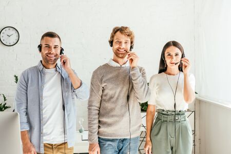 cheerful brokers in headsets standing and looking at camera
