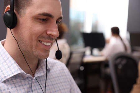 Young call center operator with headset working in modern office, closeup