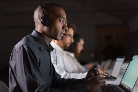 Teleworkers in headsets in dark office. Side view of professional serious business people in headsets using laptops late at night. Working late concept