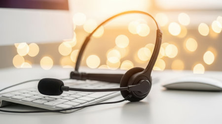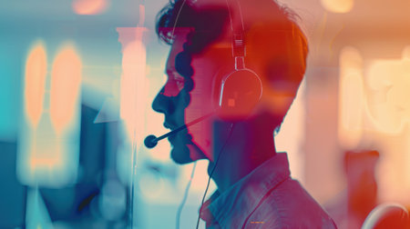 A customer service representative wears headphones and a microphone, focused on providing assistance to customers in a brightly lit office space. The lighting creates a warm and inviting atmosphere.