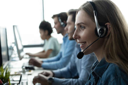 Diverse team of young professionals is working in the phone support office. Working day of sales managers in the call center. Business, telephone consulting and problem solving.