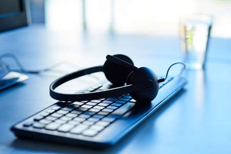 Headset and customer support equipment at call center ready for actively service . Corporate business help desk and telephone assistance concept .