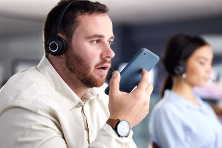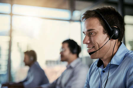 Call Center Service. Photo of customer support or sales agent. Help line answering and telemarketing. Male caller or receptionist phone operator.Copy space for some text, advertising or slogan.