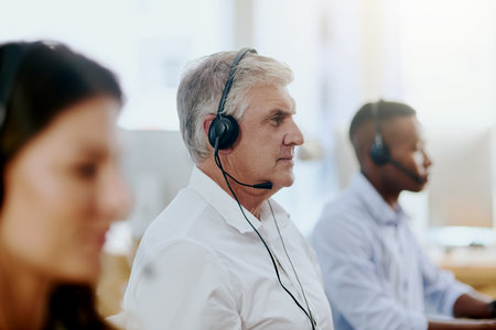 Virtual assistant, consultant or senior man typing in call center consulting at customer services help desk. Contact us, blurry or mature sales agent in telemarketing, crm or online telecom company