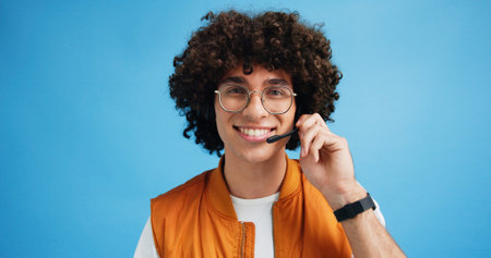 Studio, man and portrait with mic for call center, communication and customer service with smile. Space, male person and agent with headset for sales, client support and business by blue background