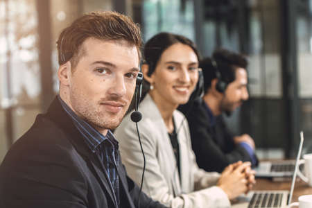 Group of business people wearing headset working actively in office. Call center, telemarketing, customer support agent provide service on telephone video conference call.