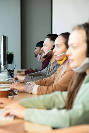 Young serious male operator and his colleagues consulting clients online