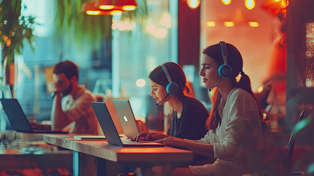 A vibrant office scene showcasing young professionals engaged in productive work with headsets and laptops, embodying collaboration and modern technology in a dynamic environment.