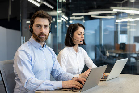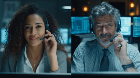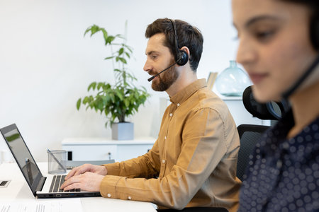 Two customer service professionals engaged in work at modern office desk. They use laptops and headsets to facilitate effective communication for their roles.