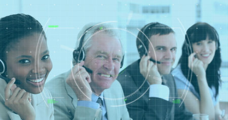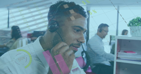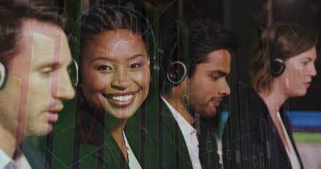 Image of financial data processing over diverse customer care executives working at office. Global finance and business data technology concept