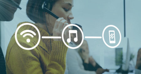 Image of media icons over diverse business people using phone headsets in office. Global business, technology and digital interface concept, digitally generated image.