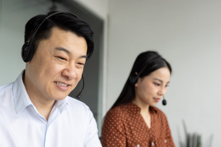 Asian office workers wearing headsets focused on telecommunication tasks. Male and female professionals collaborating in modern office setting, using phone for customer service or technical support.