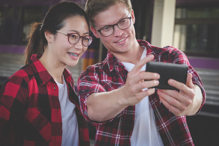 caucasian man & asian woman use smart phone to take selfie photo at train station. traveler couple travel together on holiday