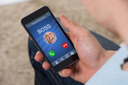 Person Hand Holding Mobile Phone With Angry Businessman Boss Calling