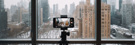 A smartphone is set on a tripod by a large window, capturing a snowy cityscape with skyscrapers in the background during winter.