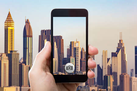 closeup shot of person holding mobile phone in hand and taking photo of beautiful sunset downtown of big city with skyscrapers, urban photography with smartphone camera. High quality photo