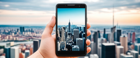 Smartphone capturing a panoramic city view