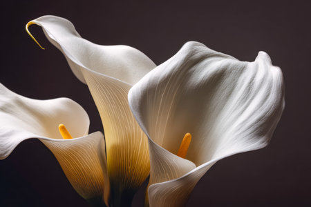 Delicate white calla lilies with vibrant yellow centers stand out boldly against a deep, moody backdrop, exuding purity and refined grace in a captivating composition.