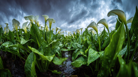 A panoramic wide view of Calla lily field growing closely together under light drizzle soft raindrops on leaves ultra realistic photography natural daylight cinematic wide composition lifelike natural scene
