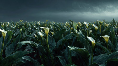 A panoramic wide view of Calla lily field growing closely together under moonlight silver glow on leaves serene calm atmosphere ultra realistic photography cinematic wide composition lifelike natural scene