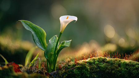 Photo of a small Calla lily growing on moss at sunrise, symbolizing hope and new beginnings. Web banner with copy space on the right for product placement.