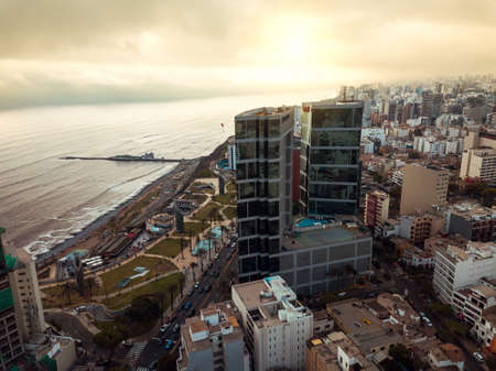 LIMA, PERU - December,12, 2018: Aerial of buildings of downtown Miraflores in Lima on a overcast day