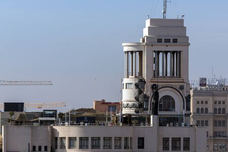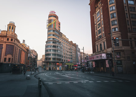 Street view of Gran Via Avenue in Central Madrid. Callao Square