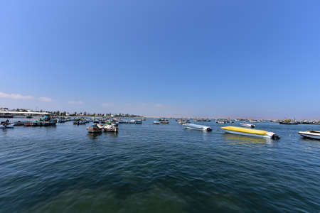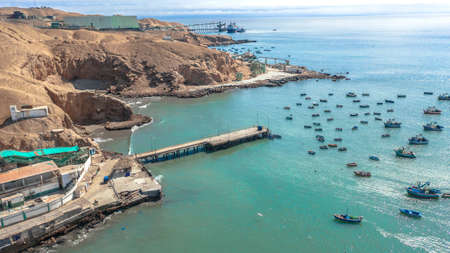 Puerto Culebras, Ancash, Peru - Circa 2020: Fishing boats close to the pier at the seaside of Huarmey circa 2020 in Ancash, Peru
