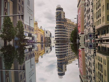 Madrid, Spain- April 21, 2021: Gran Via street in Madrid with mirror effect. Reflection of Gran Via Street in Madrid. Mirror photo. Reflections of architecture.
