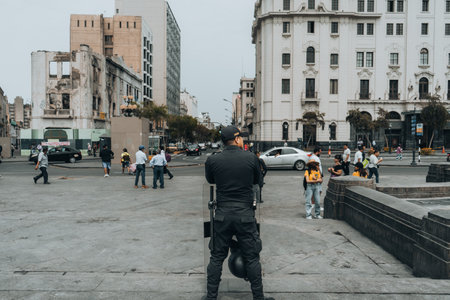Lima, Peru - January 20, 2023: Police men on the streets at San Martin Square