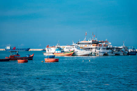 Many small boats in the harbor.Boats moored in the small harbor.Bright sea water.