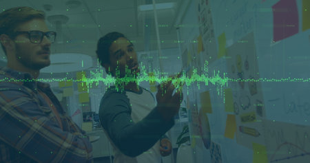 Image of data processing over diverse colleagues discussing work. Global business and digital interface concept digitally generated image.