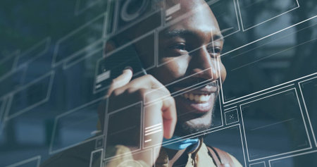 Image of social media posts and people profiles over biracial man talking on phone headset. Global social media and digital interface concept digitally generated image.