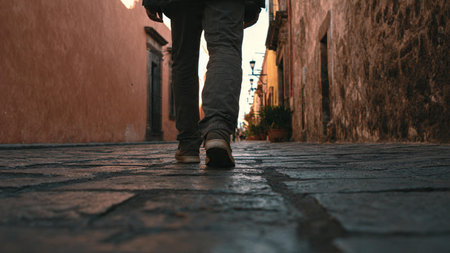 A person walks down a cobblestone street lined with historic buildings and stone walls, with a glimpse of the sky in the distance, evoking a sense of exploration and discovery.