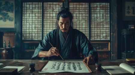 A calligrapher in a dark blue kimono holds a bamboo brush to paint black ink characters on a paper scroll while sitting in a serene japanese room with shoji screens.