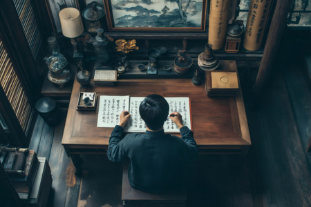High angle view of a calligrapher working at his desk in a Chinese style studio, surrounded by traditional objects