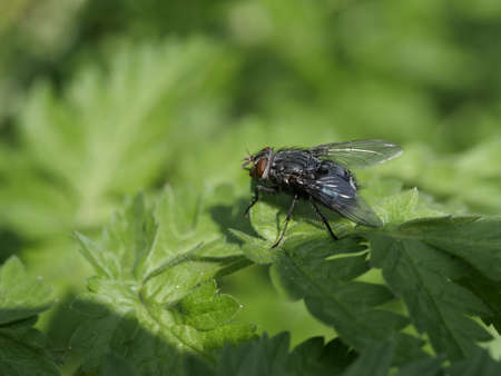 Closeup macro image of bluebottle fly, blow fly (Calliphoridae) on a green leaf in summer