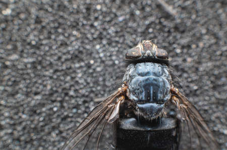 Extremely close-up of a dead fly covered with dust particles. Shallow depth of field dead insects