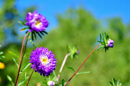 Pink aster flowers in the garden against the sky close-up. Floral background.