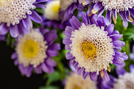 Bouquet of blue chrysanthemums close-up on a white blurred background.